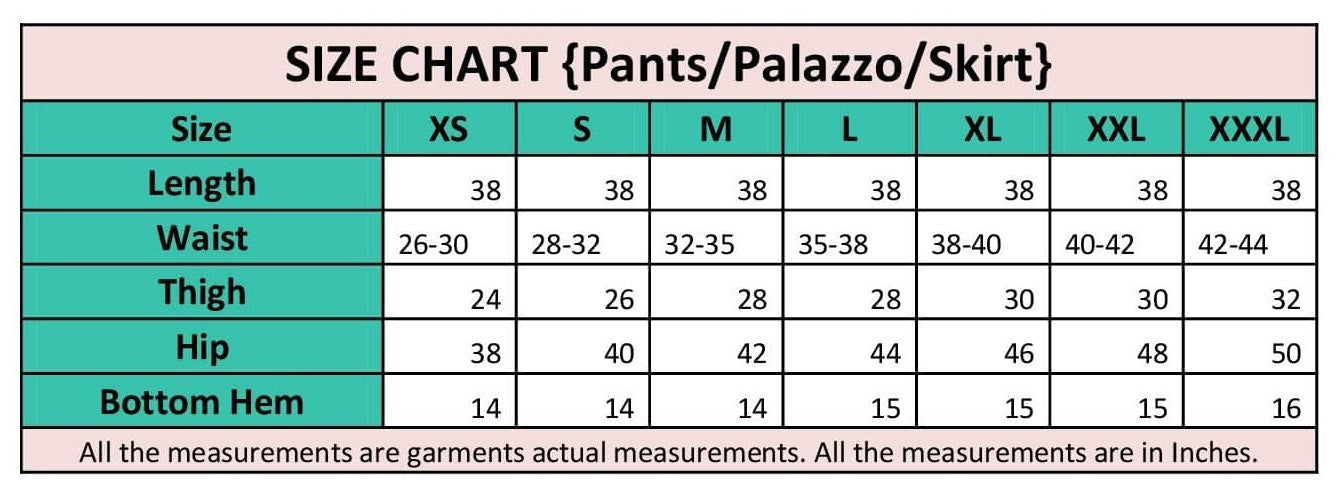 Product note - Plus sizes can be made on Custom Order upto 4XL Product Note - This pure cotton women's pant is a handcrafted and eco friendly fashion product and therefore slight variations in colors and design may occur. These imperfections are distinctive and provide each creation unique look. Such imperfections are inherent to the beauty of this creation due to nature of the product.